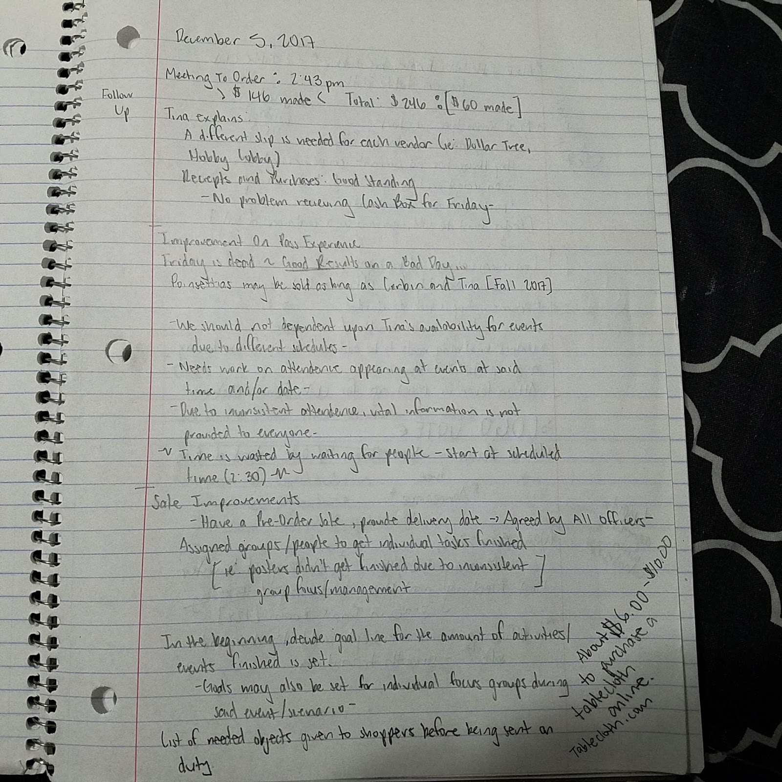 -Congratulations on the good work that everyone has done during the December 1, 2017 Holiday Horticulture Sale; We have made it to $60 above ground (basically the amount made after taking Petty Cash and Loaned Change Money into account), which puts off in a good start!Additions/ Amendments that can be made for future sales/events: